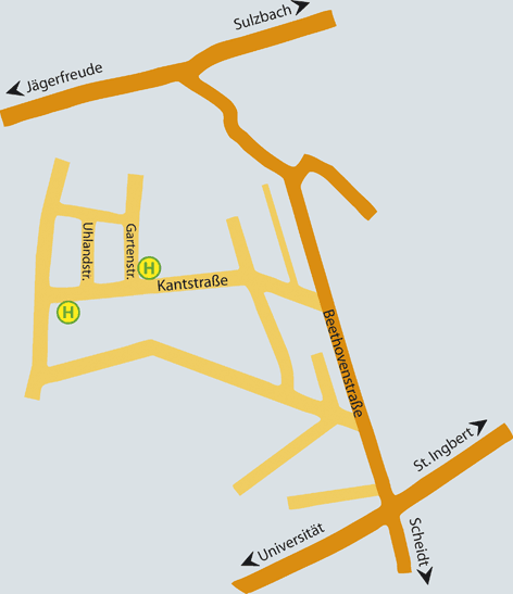 Die nächstgelegenen Haltestellen zu unserer Praxis sind die Haltestellen „Gartenstraße“ bzw. „Kantstraße“. Sie werden von den Bussen der Saartal-Linien 101, 102 (Einsteigemöglichkeit z. B. ab Saarbrücker Rathaus) bzw. 133 (verkehrt nur innerhalb von Dudweiler; Einsteigemöglichkeit ab Dudweiler-Dudoplatz) angefahren.